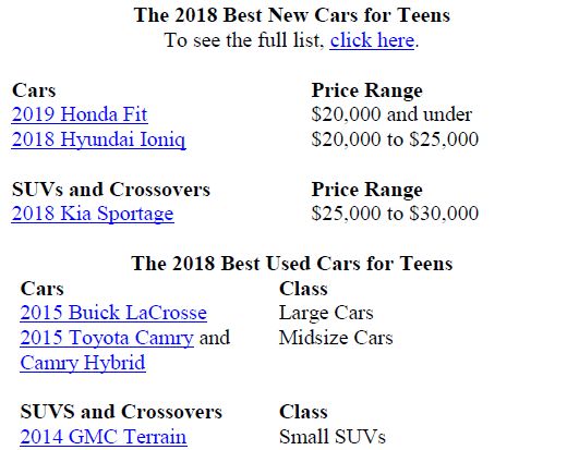 To see the full 2018 list of Best New Cars for Teens, click here.